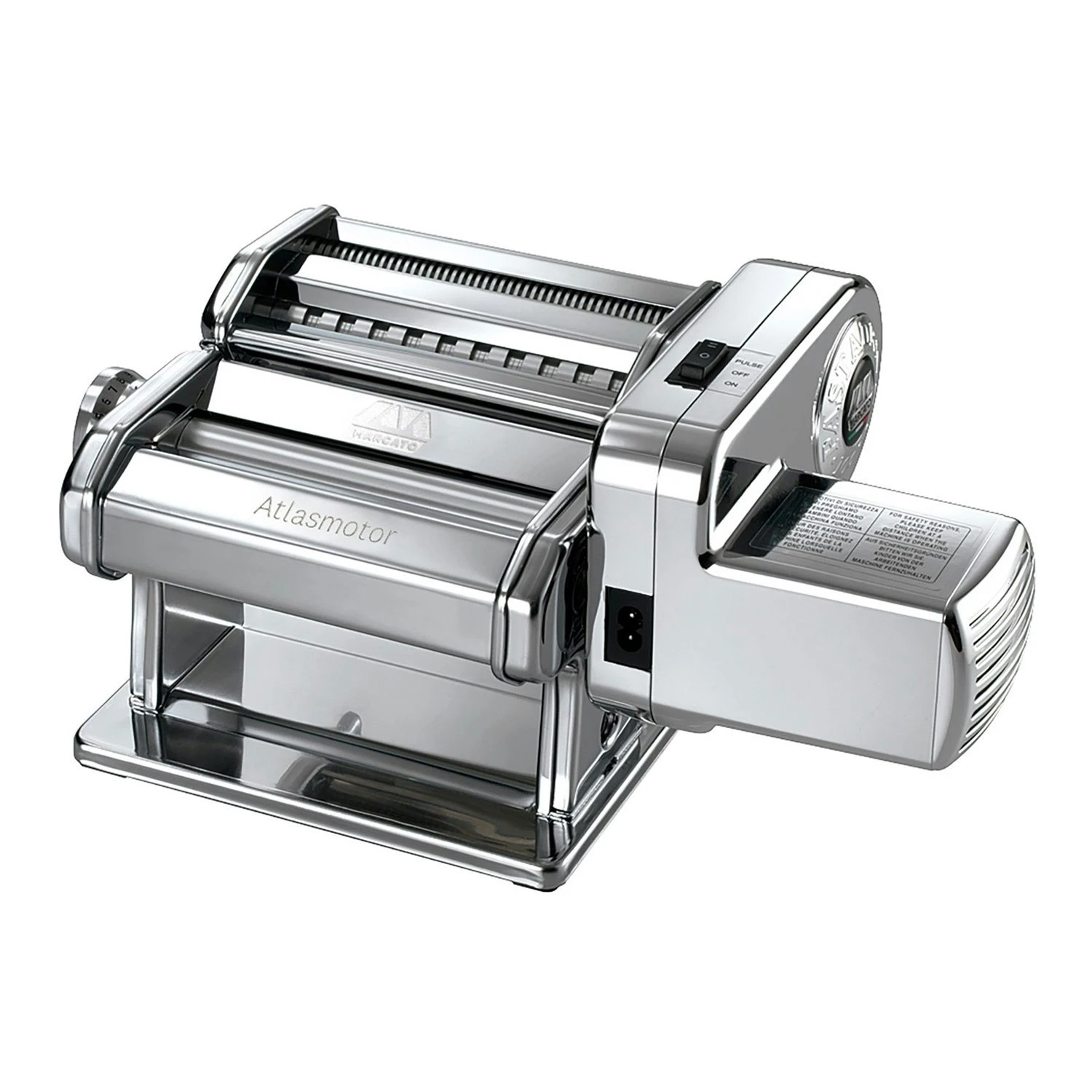 Marcatos klassieke pastamachine met motor. De machine heeft een instelbare lasagneplaatdikte, van 0,6 tot 4,8 mm. Fettuccine (6 mm) en tagliolini (1,5 mm) rollers inbegrepen. Maximale breedte lasagneplaatje: 15 cm. Inclusief tafelbeugel.